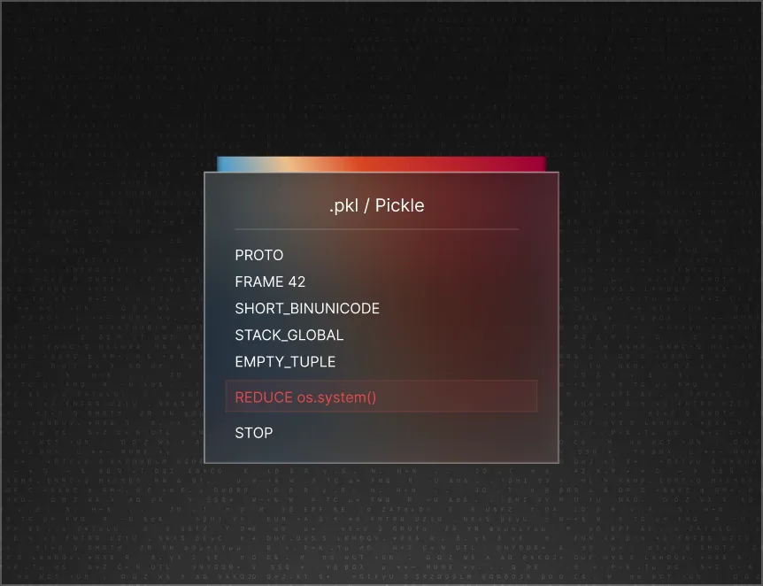 (.pkl, .pt, .pth, .ckpt, .bin, .joblib): Opcode-level analysis. Detects dangerous imports and code execution patterns like os.system, subprocess, eval.